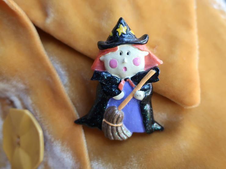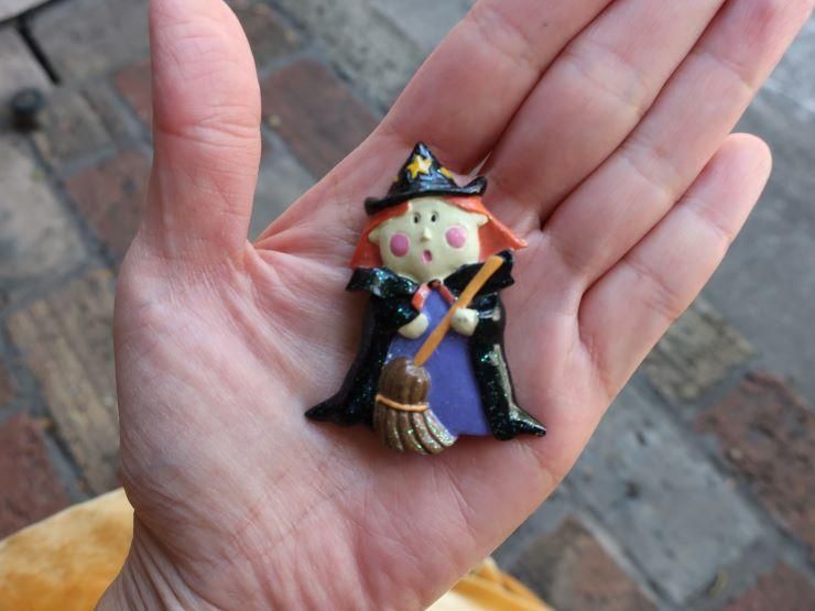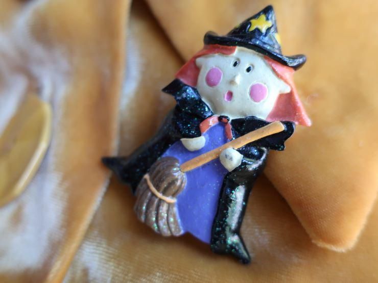 ハロウィンブローチ、魔女コレクションです。こちらはちょっとラメラメの魔女。