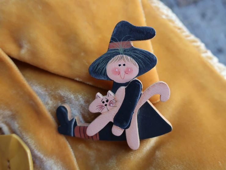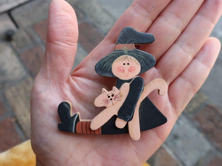ハロウィンブローチ、魔女コレクションです。ネコを抱えた魔女は木製のベースに優しいタッチで手描きされています。