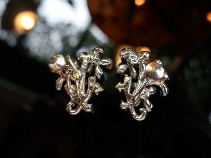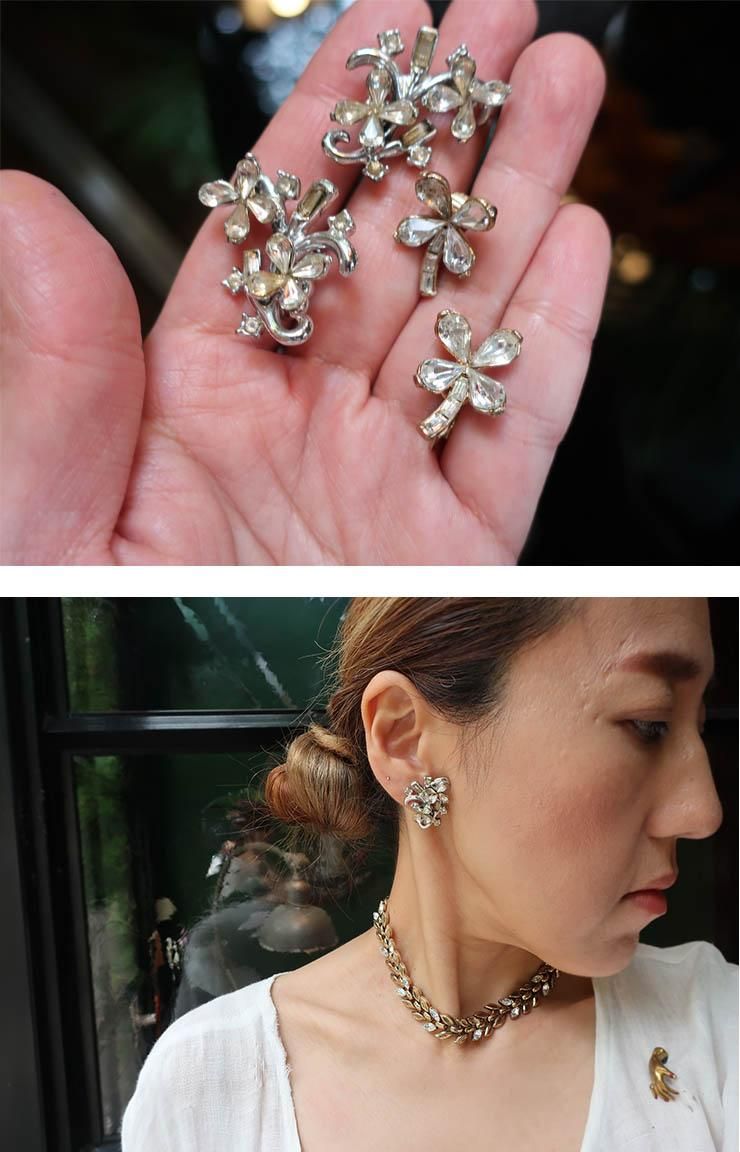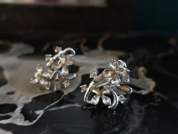 シルバー色のメタル台にお花型にラインストーンが組まれたイヤリング。凝ったデザインが魅力でトリファリのお花のシリーズに雰囲気が似ています。留め具はスクリュータイプなので慣れない方はつけにくいかもしれませんが、留め具の強さの調節ができるのは便利です。下の写真ではトリファリのイヤリングと並べてみました。