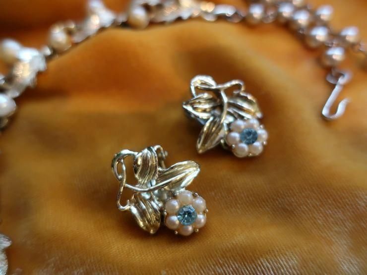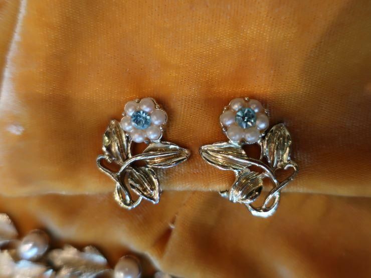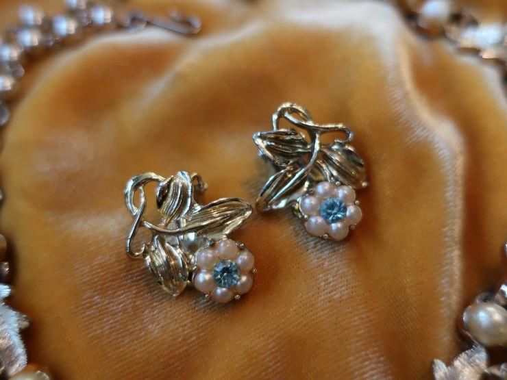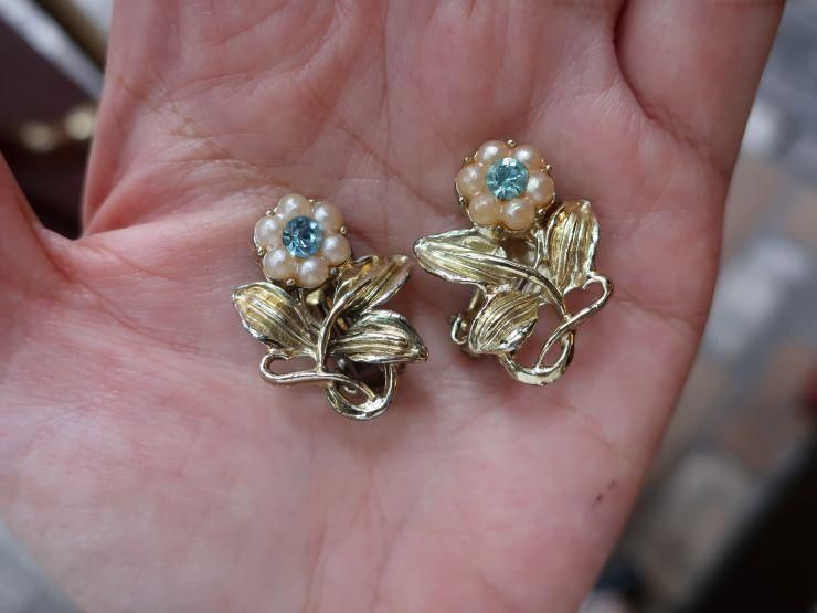 小さなパールのお花が可憐なイヤリング。ゴールドの色は少しシルバーがかった明るい色。お花の中心のアクア色のストーンがさわやかです。経年によりパール加工に一部薄れが見られますがもともとのパールカラーがベージュ色なのでそれほどダメージと指摘にならないように思います(写真でご確認ください)。