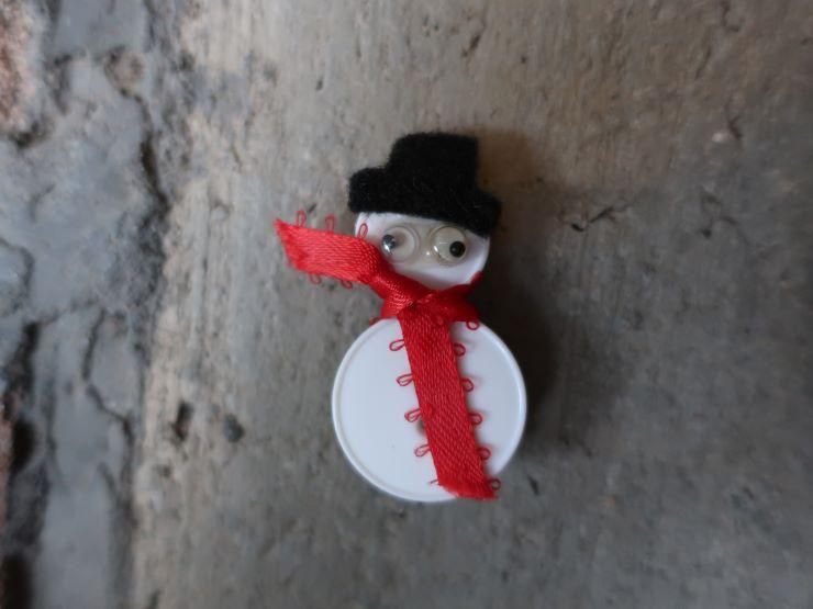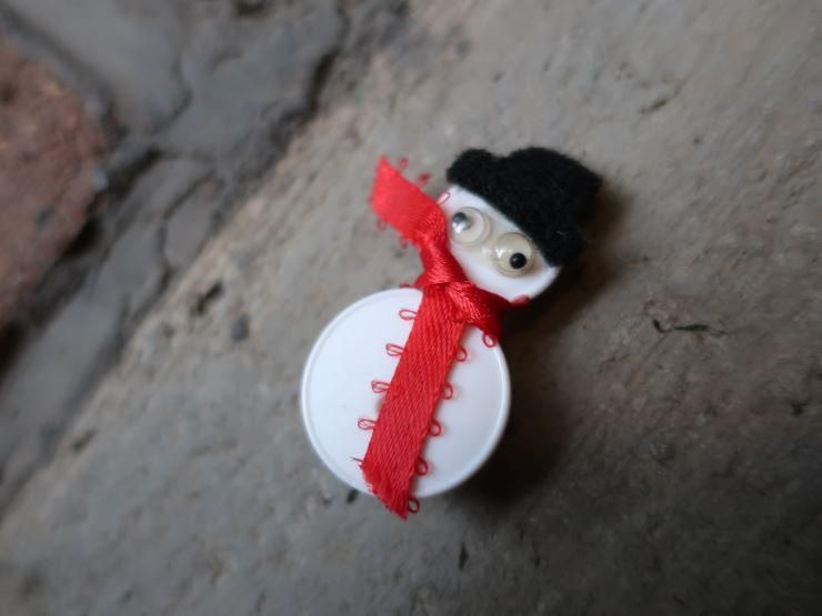 ボタンで出来たスノーマン。きょろきょろの目がポイント。ハンドメイド品のラフな作りをご理解いただき、お買い上げのほどよろしくお願いします。